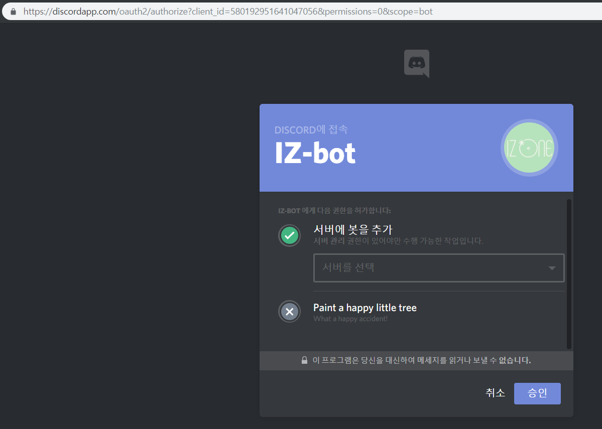 복사한 주소로 접속하시면 이렇게 페이지가 뜰 것인데, 서버에 봇을 추가해주시고 자신의 서버중 원하는 서버를 골라