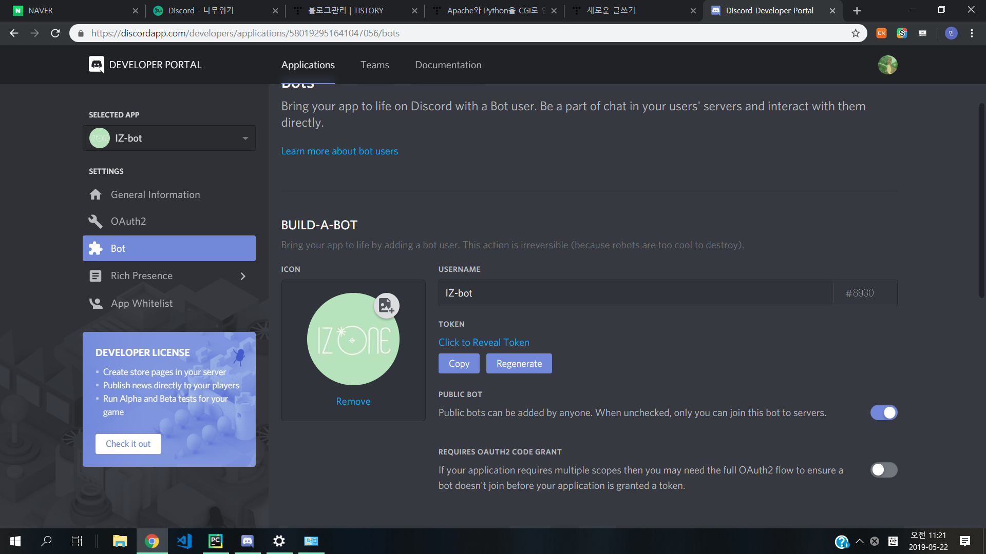 지금 진행 상황은 디스코드 봇을 생성하는 것과 자신의 서버에 초대하는 것 까지 해봤습니다.